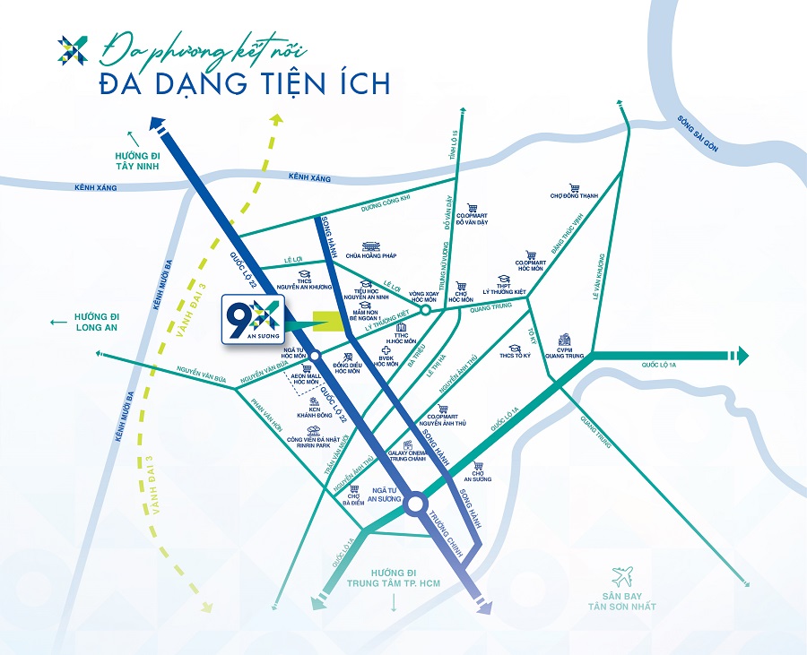 9X An Sương sở hữu vị trí “vàng” ngay mặt tiền đường Song Hành, trung tâm thị trấn Hóc Môn, cách cầu vượt An Sương chỉ 500m và nút giao quốc lộ 1A – quốc lộ 22. Đây là khu vực giao thoa giữa ngoại ô thanh bình và đô thị sôi động, mang lại không khí trong lành nhưng vẫn kết nối nhanh chóng đến trung tâm TP.HCM.