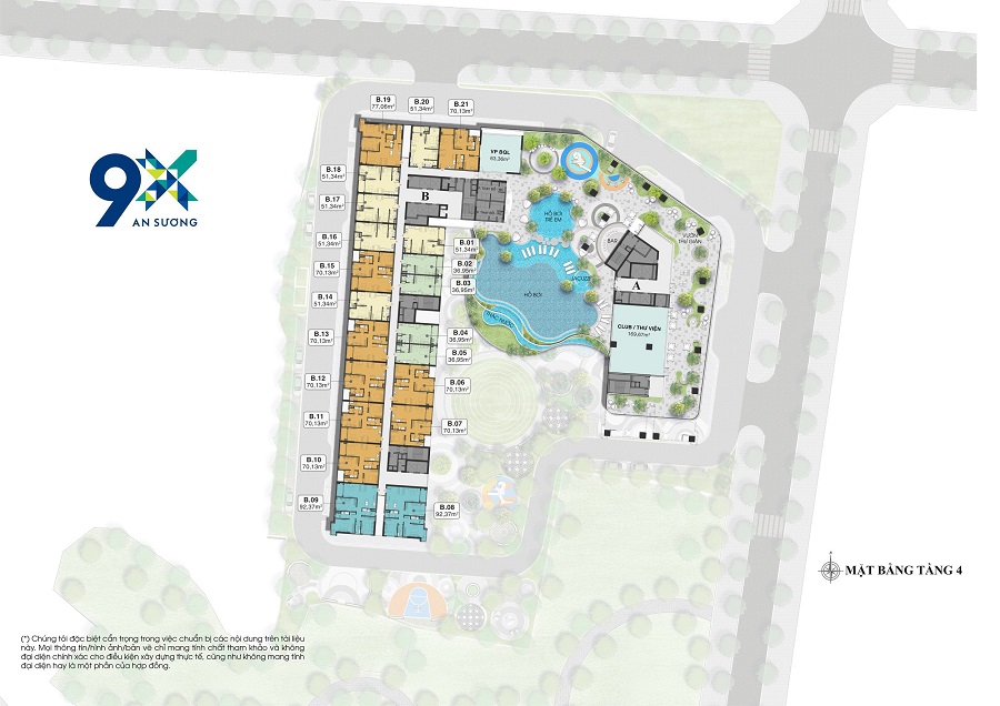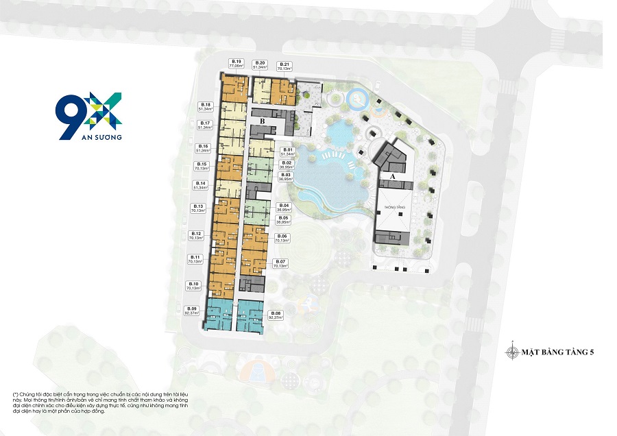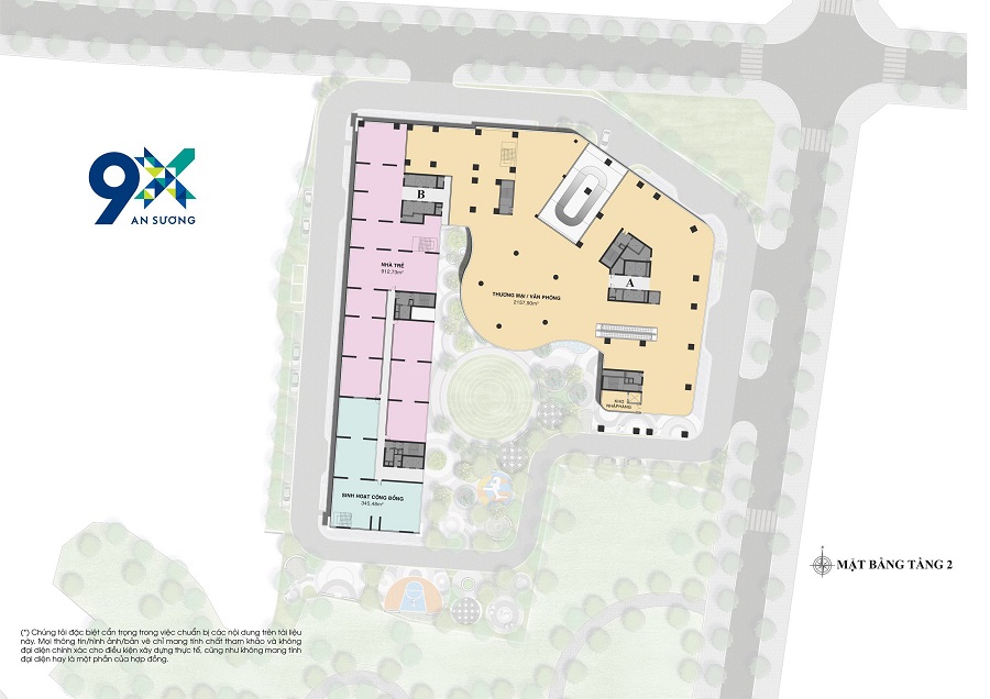 Mặt bằng quy hoạch 9X An Sương được lập kế hoạch tinh tế trên diện tích ~9.500 m², với 2 block cao 25 tầng bố trí hài hòa để tối ưu hóa tầm nhìn thoáng và luồng gió tự nhiên. Mật độ xây dựng thấp giúp dành phần lớn diện tích cho tiện ích cộng đồng, công viên nội khu và lối đi bộ xanh. Các tầng điển hình bố trí 10-15 căn/block, đảm bảo sự riêng tư, kết hợp tầng hầm rộng rãi cho đỗ xe và khối đế thương mại sầm uất.