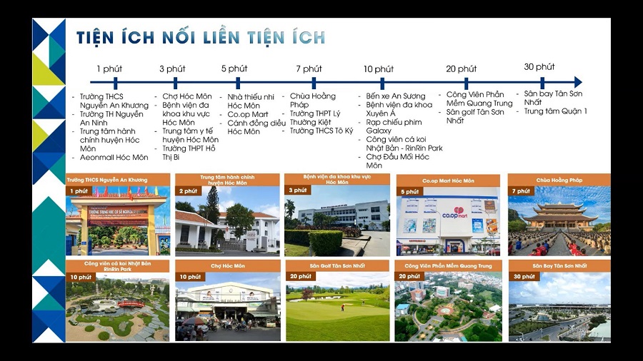 - Dễ dàng tiếp cận các tiện ích như chợ Hóc Môn, bệnh viện Hóc Môn, bệnh viện Xuyên Á, công viên phần mềm Quang Trung
