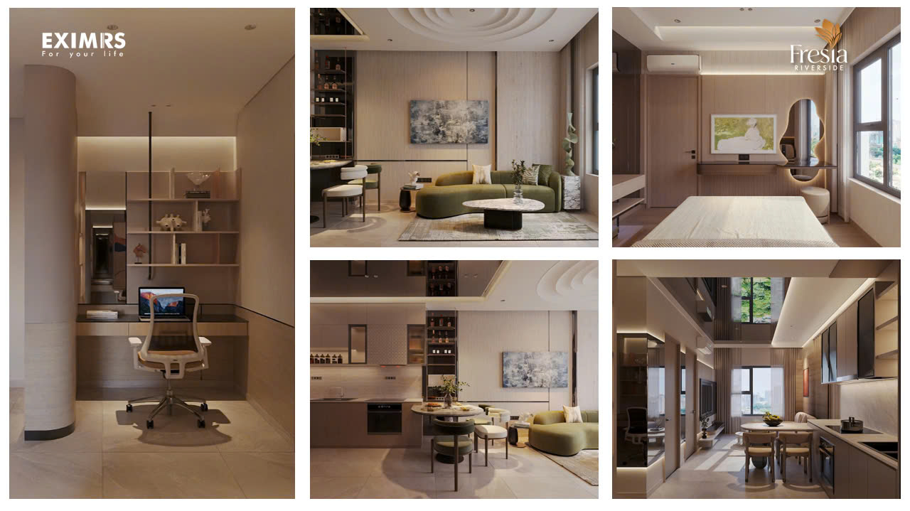 Thiết kế chi tiết tại Fresia Riverside Biên Hòa tập trung vào sự thông minh và tiện nghi, với các căn hộ đa dạng từ 28,74 m² (1PN) đến 118,73 m² (shophouse), phù hợp mọi nhu cầu.