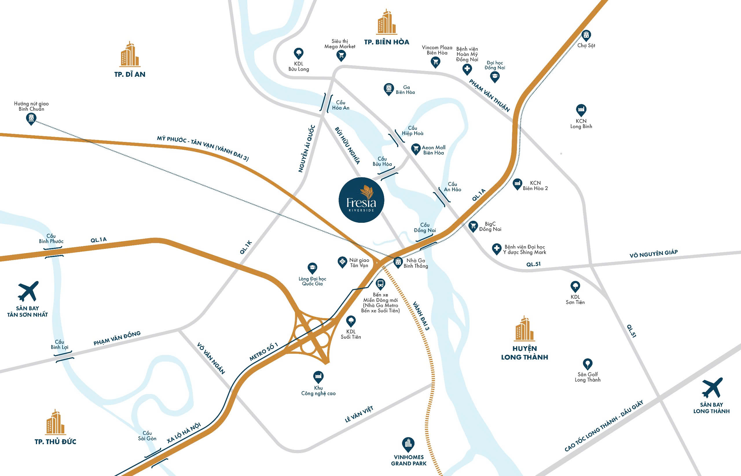 Vị trí của Fresia Riverside Biên Hòa chính là “vũ khí bí mật” giúp dự án nhanh chóng thu hút sự chú ý từ cộng đồng đầu tư bất động sản. Nằm ngay mặt tiền đường Bùi Hữu Nghĩa, phường Tân Vạn, TP. Biên Hòa, dự án tọa lạc tại nút giao quan trọng của vành đai 3 Mỹ Phước – Tân Vạn, tạo nên sự kết nối tam giác vàng kinh tế giữa TP.HCM, Bình Dương và Đồng Nai. Nằm gần Xa lộ Hà Nội (Quốc lộ 1A) và đối diện AEON Mall Biên Hòa mang lại lợi thế vượt trội, trong khi vị trí liền kề Ga Metro hứa hẹn giá trị tăng trưởng mạnh mẽ theo sự phát triển của hệ thống giao thông công cộng.