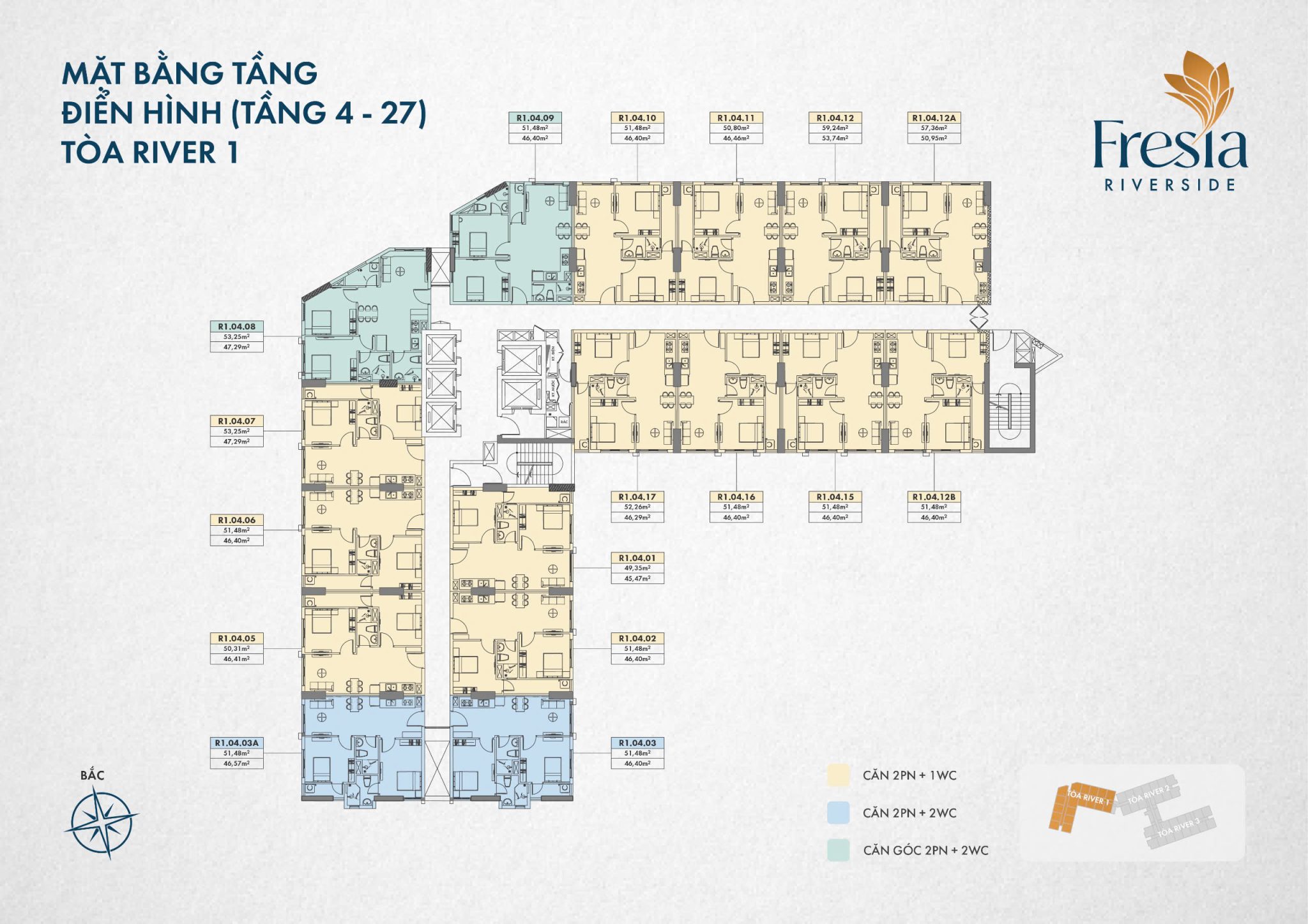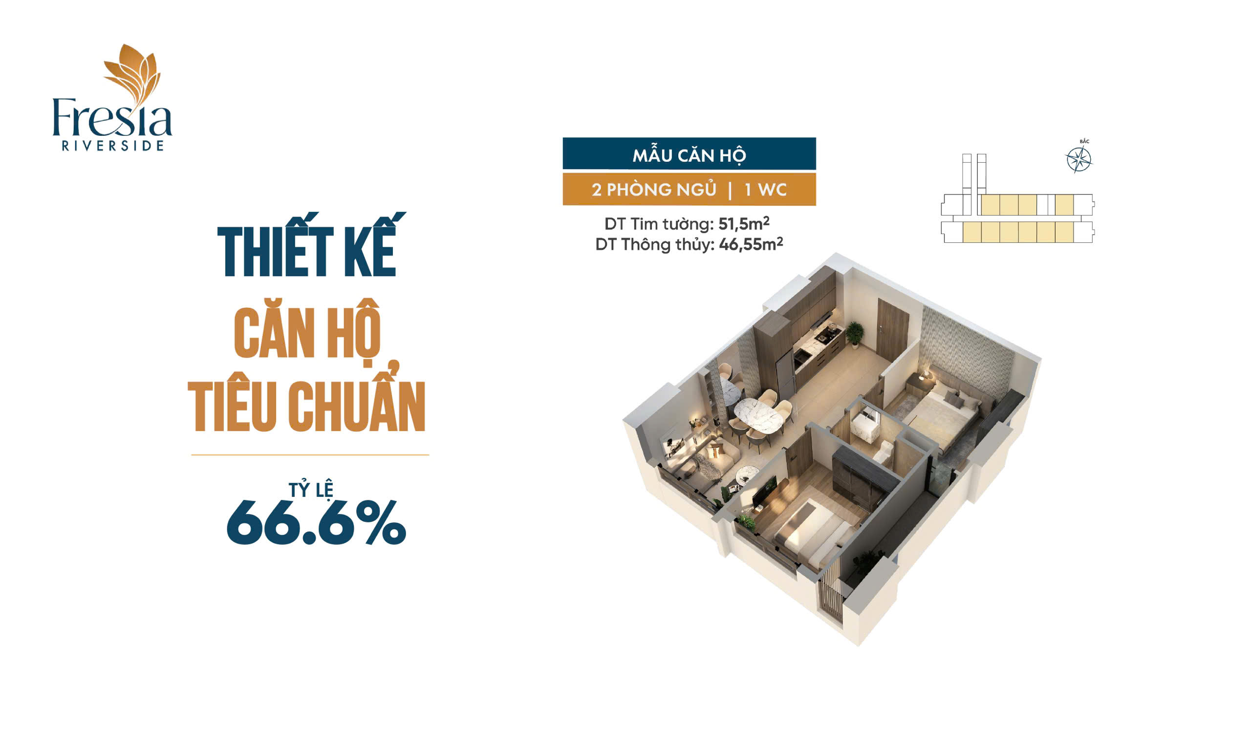 • Căn 2 PN, 1 WC: 816 căn (49,35 – 59,24 m²)