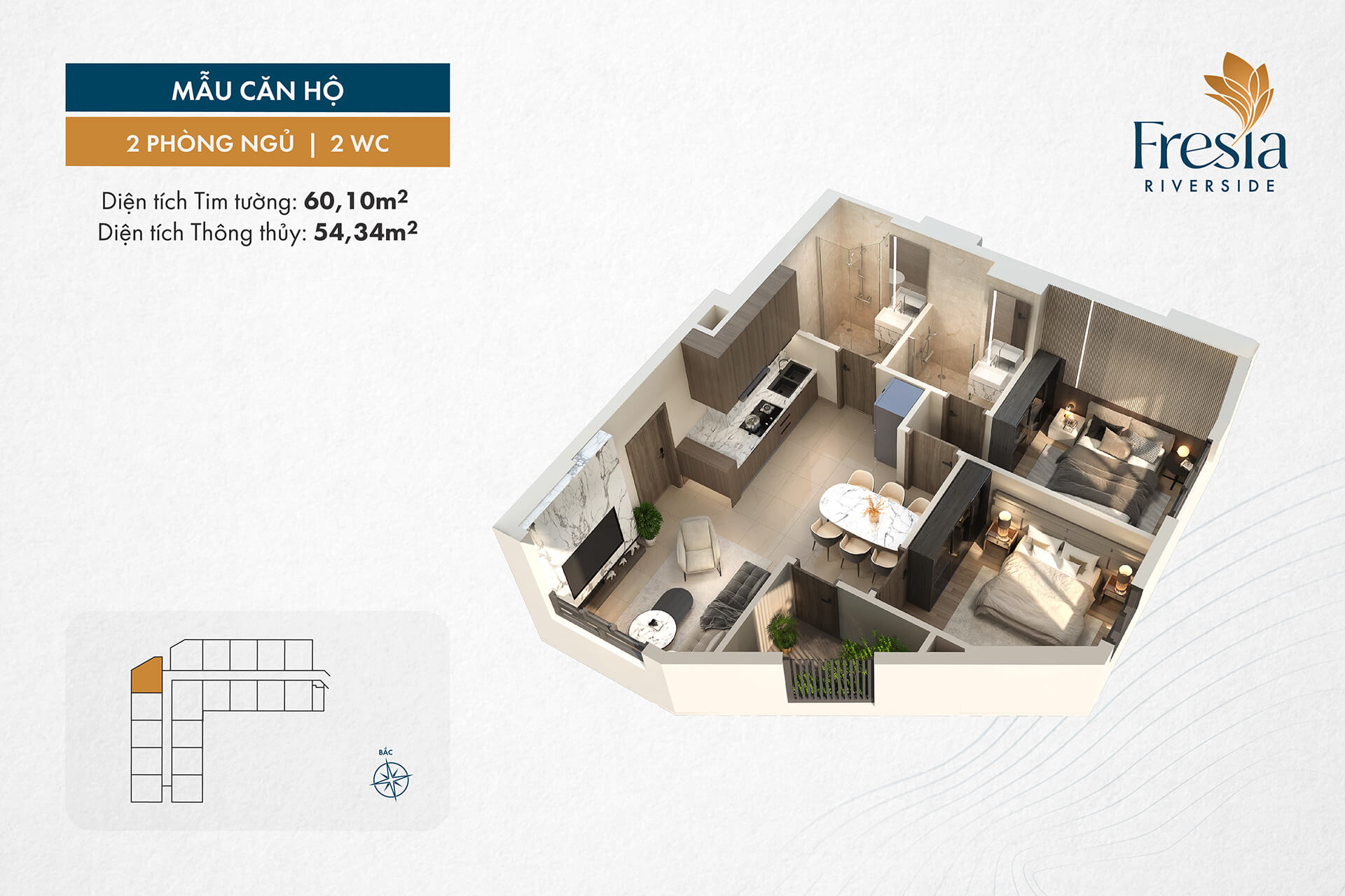 Mặt bằng quy hoạch của Fresia Riverside Biên Hòa được lập kế hoạch tinh tế trên khu đất rộng lớn, với mật độ xây dựng chỉ 32% để ưu tiên không gian xanh và tiện ích cộng đồng. Tháp đôi 30 tầng nổi cùng 3 tầng hầm được phân bổ hợp lý, tạo nên luồng không khí lưu thông tự nhiên và tầm nhìn panorama ra sông Đồng Nai từ hầu hết các căn hộ.