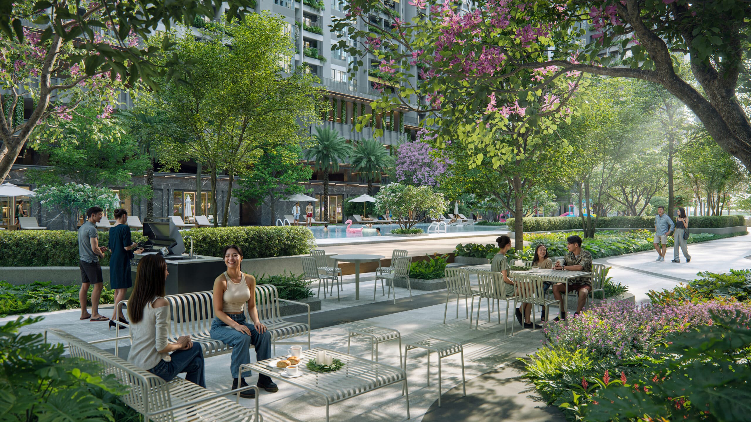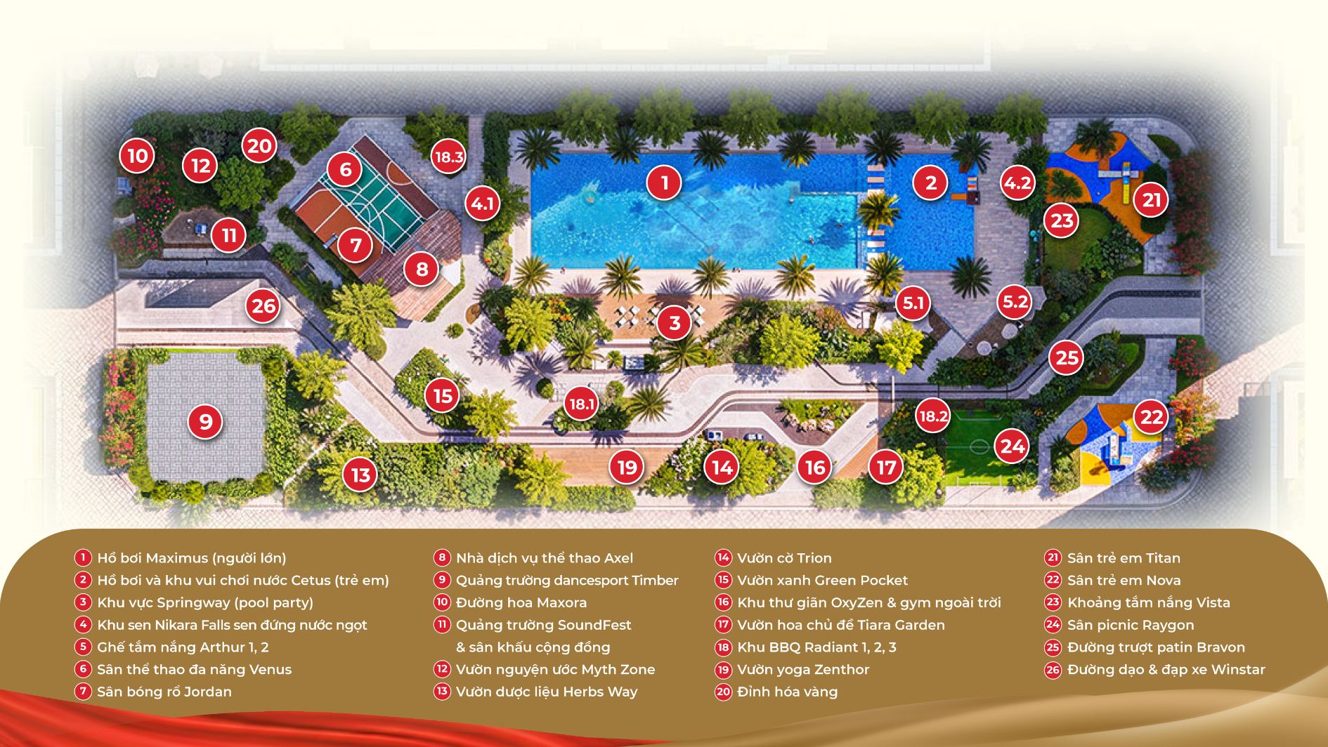 • Không gian thư giãn và cộng đồng: Vườn xanh Green Pocket, Khu thư giãn OxyZen, Vườn hoa Tiara Garden và Khu BBQ Radiant.
