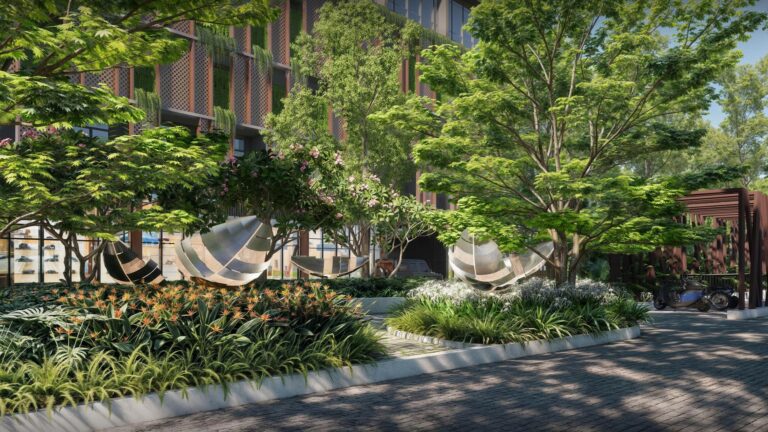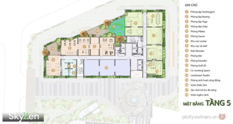 Cư dân còn được hưởng tiện ích đa tầng: tầng 5 với công viên trung tâm, vườn thiền Zen, đường dạo bộ, sân chơi trẻ em, phòng gym hiện đại, yoga, sauna; tầng 1 với shophouse, minimart, coffee lounge, sảnh đón sang trọng.