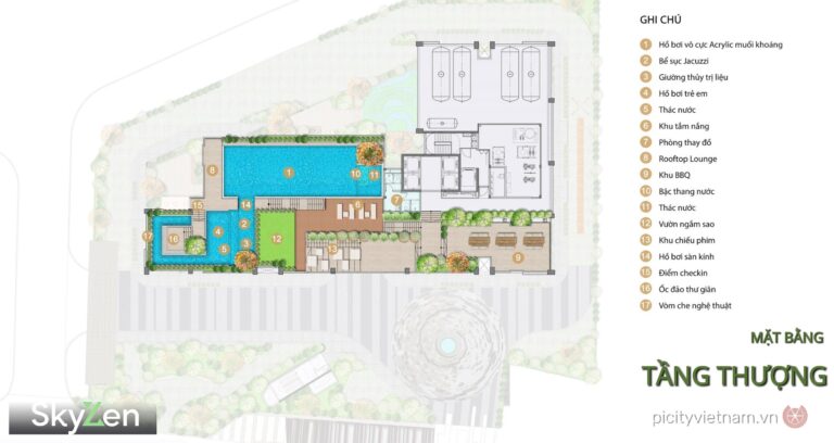 Picity Sky Zen Phạm Văn Đồng nổi bật với hơn 65 tiện ích nội khu chuẩn 5 sao, dành tỷ lệ lớn diện tích cho không gian xanh (khoảng 57%), tạo cảm giác resort tại gia. Điểm nhấn là hệ thống sky park tại tầng 38-39 với hồ bơi vô cực muối khoáng panorama view toàn thành phố, hồ bơi trẻ em, jacuzzi, sky lounge, khu BBQ ngoài trời và đài quan sát.