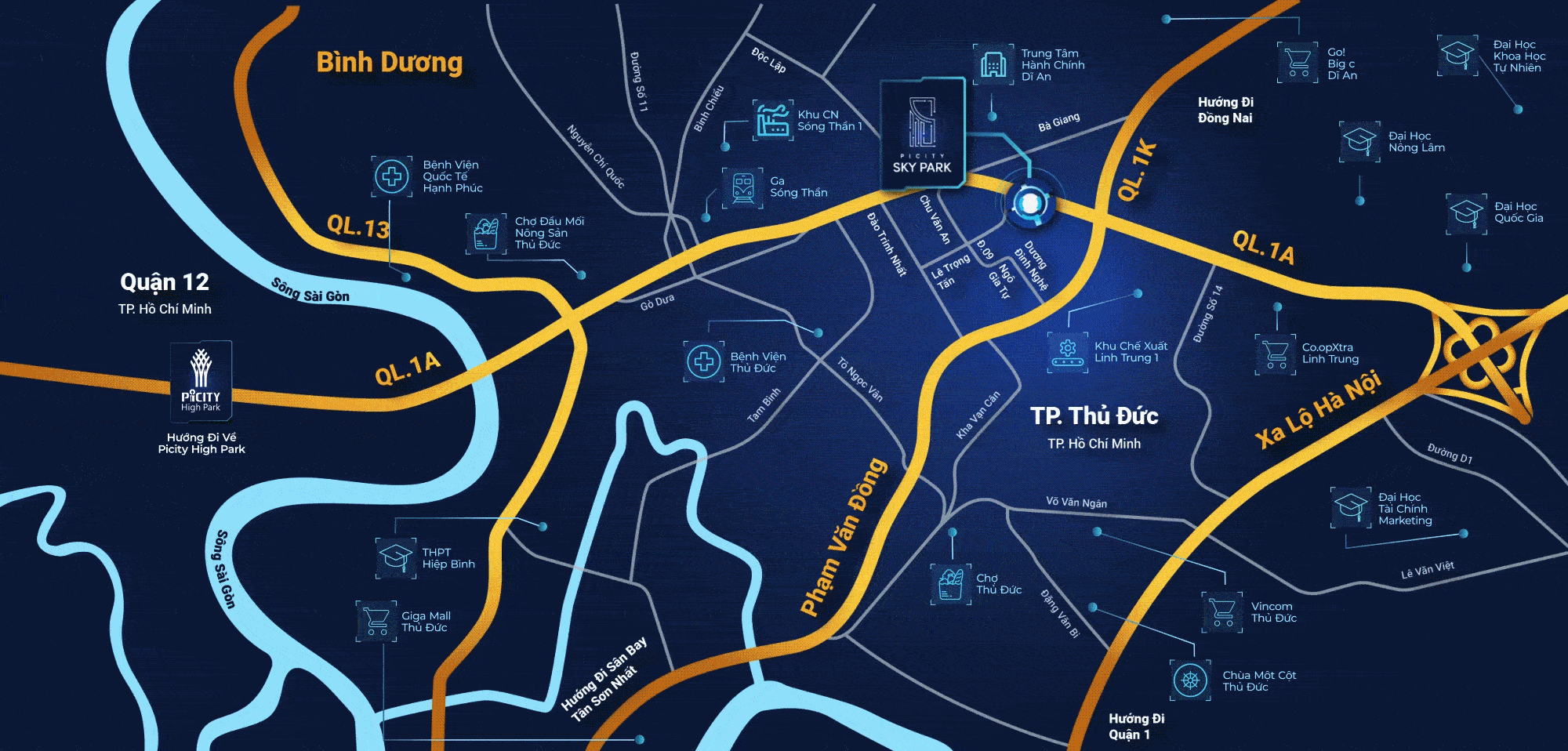 Picity Sky Zen Phạm Văn Đồng sở hữu vị trí vàng ngay mặt tiền Quốc lộ 1A, thuộc phường An Bình, TP. Dĩ An (nay thuộc TP.HCM sau sáp nhập), chỉ cách đại lộ Phạm Văn Đồng 500m. Đây là nút giao huyết mạch kết nối TP.HCM – Bình Dương – Đồng Nai, giúp cư dân di chuyển nhanh chóng đến trung tâm Thủ Đức chỉ 5-10 phút, quận 1 khoảng 25-30 phút và sân bay Tân Sơn Nhất trong vòng 30 phút.