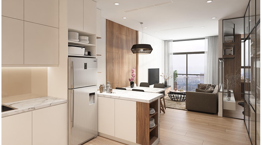 - Căn 2PN loại C/D (50m² tim tường, 46-47m² thông thủy) phù hợp gia đình trẻ, với ban công đón sáng tự nhiên và bếp đầy đủ tủ trên/dưới