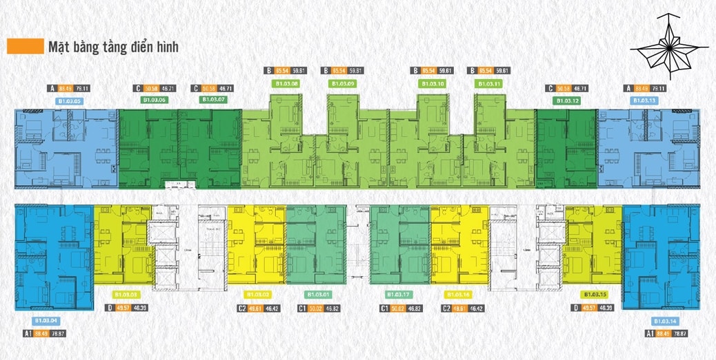 - Block B1 (34 tầng) tập trung căn hộ trung tâm với 557 sản phẩm