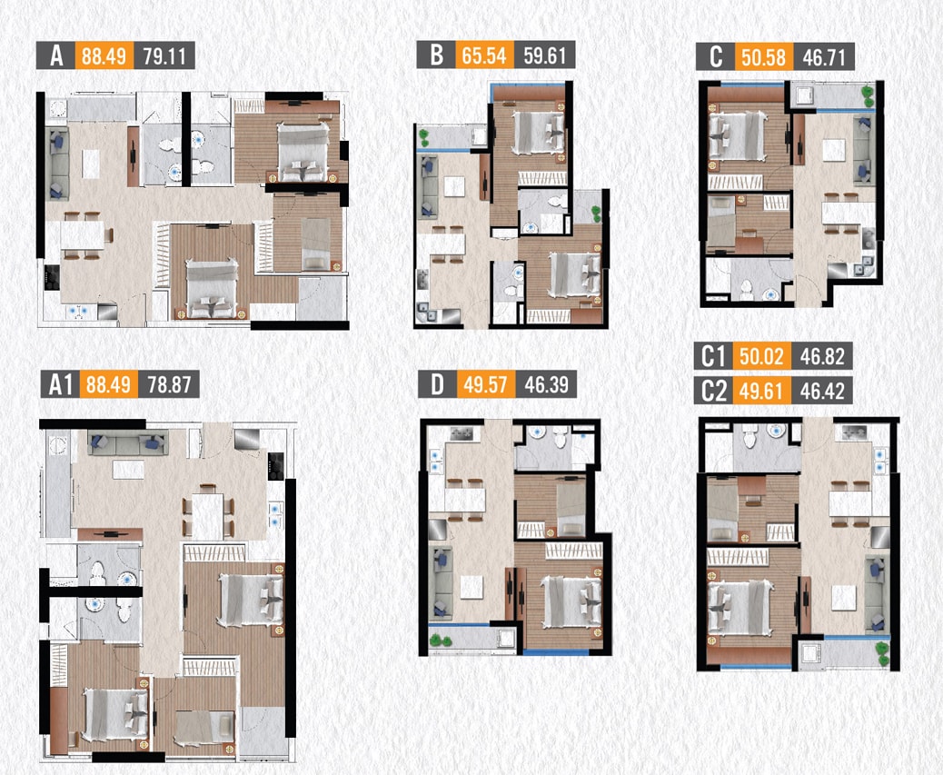 | Loại hình căn hộ | 2-3 PN, diện tích 50-89 m² |