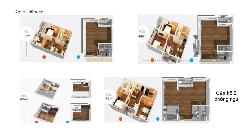Các loại diện tích căn hộ (38m², 44m², 57m²) và công năng sử dụng