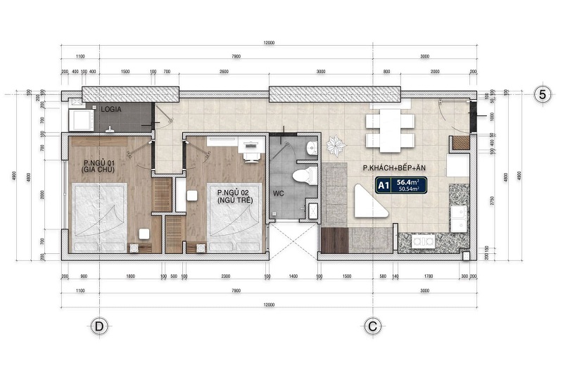 Layout thiết kế căn hộ Roxana Plaza mẫu A1 2 phòng ngủ 1 wc, diện tích 56m2