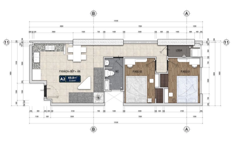Layout thiết kế căn hộ Roxana Plaza mẫu A2 2 phòng ngủ 1 wc, diện tích 60m2