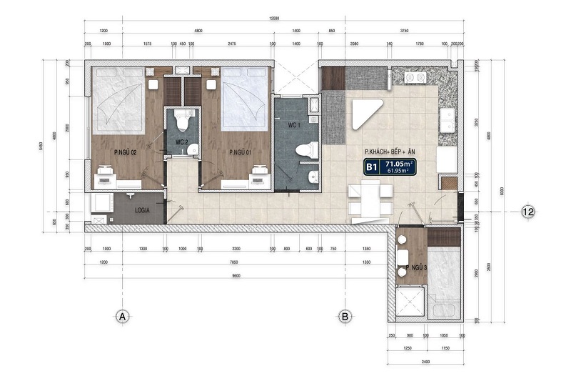 Layout thiết kế căn hộ Roxana Plaza mẫu B1 3 phòng ngủ 2 wc, diện tích 71.05m2
