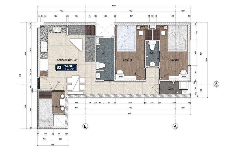 Layout thiết kế căn hộ Roxana Plaza mẫu B2 3 phòng ngủ 2 wc, diện tích 74.88m2