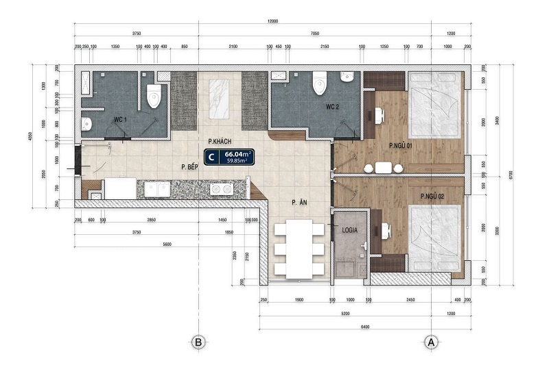 Layout thiết kế căn hộ Roxana Plaza mẫu C 2 phòng ngủ 2 wc, diện tích 66,04m2