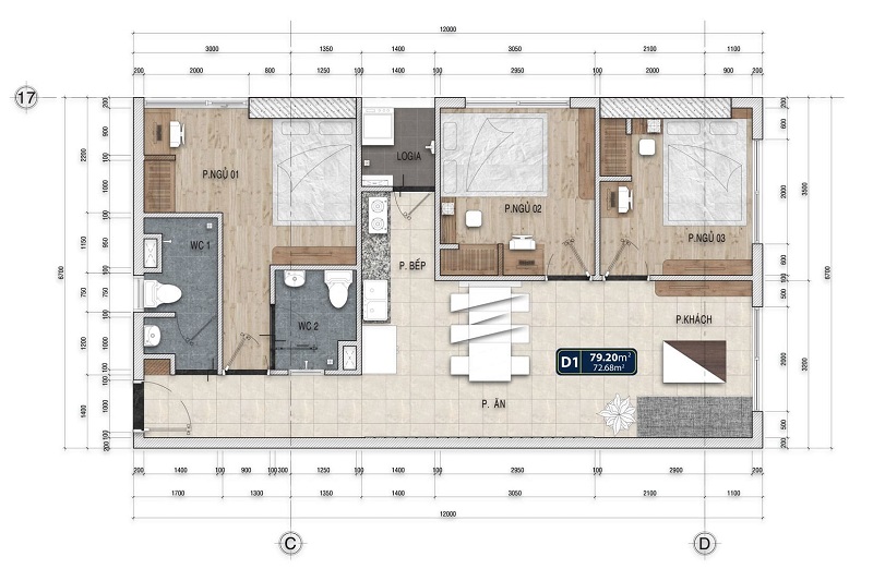 Layout thiết kế căn hộ Roxana Plaza mẫu D1 3 phòng ngủ 2 wc, diện tích 79,20m2