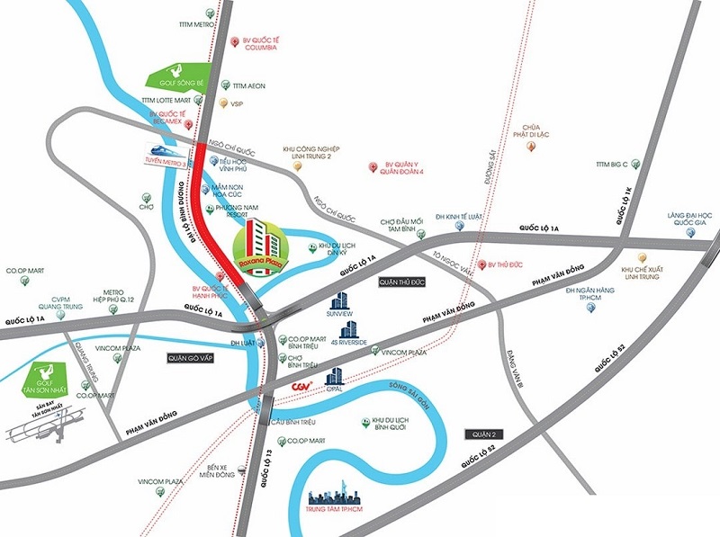 Dự án sở hữu vị trí mặt tiền Đại lộ Bình Dương, ngay cửa ngõ Đông Sài Gòn, liền kề Quốc lộ 13, giúp di chuyển về TPHCM và sân bay Tân Sơn Nhất thuận lợi. Hệ thống giao thông khu vực được đánh giá cao với các trục đường huyết mạch như Phạm Văn Đồng, Quốc lộ 1A, Quốc lộ 13, rút ngắn thời gian kết nối liên vùng.