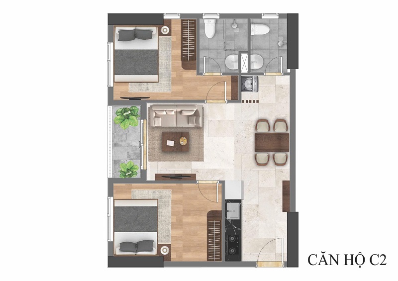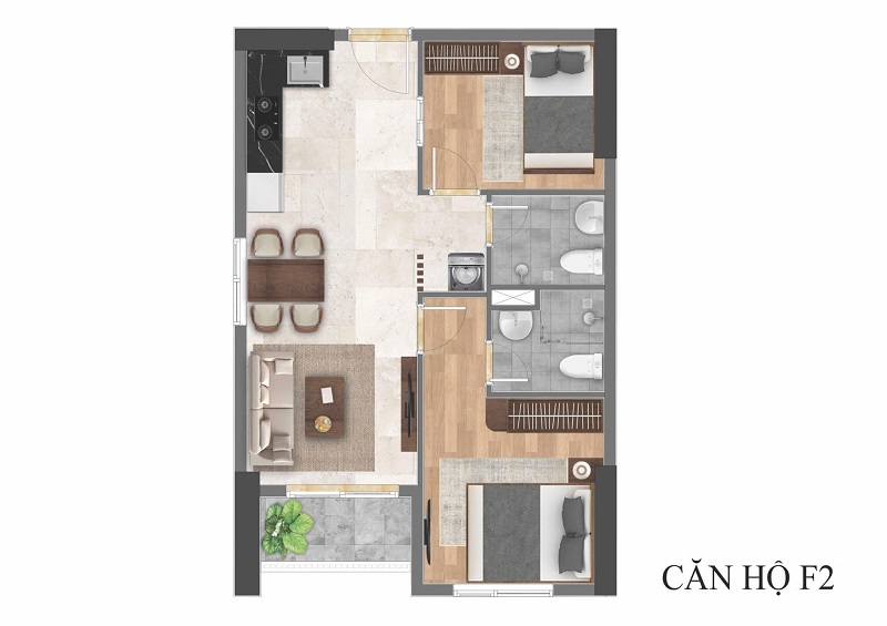 - Căn hộ 2 phòng ngủ: Diện tích khoảng 51 – 65 m², bố trí 1 hoặc 2 WC, giá dao động từ 1,9 – 2,5 tỷ đồng/căn, đáp ứng tốt nhu cầu ở thực của gia đình trẻ.