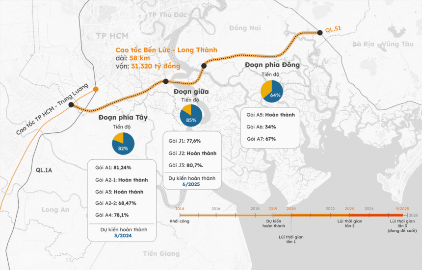 Cao tốc Bến Lức – Long Thành là một trong những dự án hạ tầng giao thông trọng điểm quốc gia, được khởi công từ năm 2014 nhưng từng gián đoạn do khó khăn về vốn.